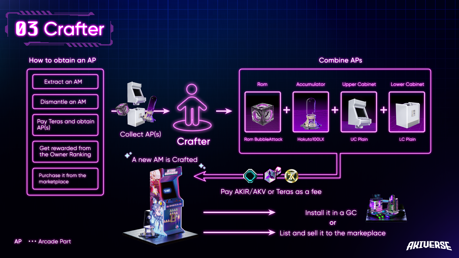 Crafters can create new Arcade Machines by combining their four Arcade Parts using the Craft mechanism which consumes AKIR/AKV or Teras.